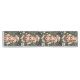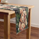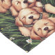 A table runner with a pattern of four adorable golden retriever puppies sleeping in a field of green grass and white flowers.