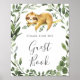 Give your guests a lovely direction with our sleeping sloth guestbook sign, featuring watercolor greenery eucalyptus garland and elegant handwritten style font.