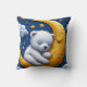 Soft decorative pillow featuring a sleeping teddy bear curled on a crescent moon against a starry night background, perfect for nursery decor, baby rooms, kids bedding, gifts and cozy sleep scenes.