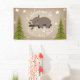 A banner featuring an illustration of a sleepy bear resting on a tree branch over a brown cardstock inspired background. Bear is surrounded by stars and between two evergreen trees. Personalize the text.