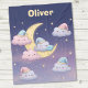 This personalized fleece blanket features pastel-colored clouds wearing tiny nightcaps, peacefully resting on and around a crescent moon. Surrounded by glowing stars and a soft gradient of deep blues, purples, and pinks, this tranquil nighttime scene is perfect for nurseries and kids' rooms.
