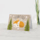 A thank you card featuring an illustration of a fox lounging between two evergreen trees surrounded by stars. Background is card stock inspired. Matching baby shower invitations at coordinating items are available at Jill's Paperie.