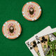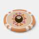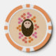 This awesome set of poker chips features a cute cartoon of a little brown spiky hedgehog curled up in a ball looking sleepy. The Hedgehog is surrounded by pretty flowers. The hedgehog is brown with a cream face and the flowers are red, orange and pink.