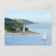 A sailboat navigates past Sletterhage Lighthouse on the eastern coast of Jutland in Denmark. Crowds enjoy the sunny weather as they gather on the shore.