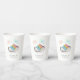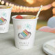 Perfect for engagement parties, rehearsal dinners, or wedding showers, these festive paper cups feature a watercolor slice of layer cake in rainbow hues, topped with sparklers and aqua confetti. Personalize with your names and wedding date or event date beneath.