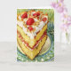 From a vintage magazine. An illustration of a thick slice of white layer cake with strawberry filling. White frosting and strawberries are on top. It's set on a pretty plate with a green and blue patterned edge