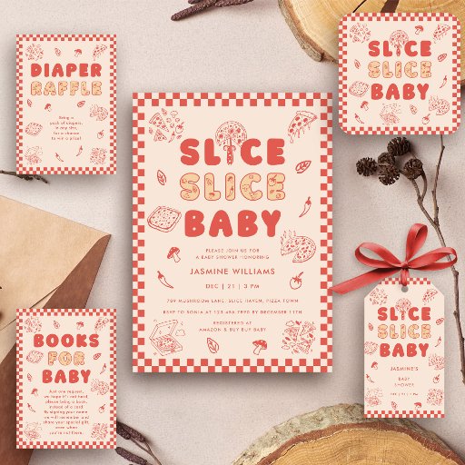 This charming Slice Slice Baby Pizza Hand-Drawn Baby Shower Collection features a playful red plaid frame reminiscent of a classic pizzeria. The bold "SLICE SLICE BABY" tagline takes center stage, surrounded by whimsical hand-drawn illustrations of pizza slices, fresh ingredients like basil, tomatoes, mushrooms, and peppers, and rustic details that add a cozy, Italian-inspired touch. Perfect for celebrating a little one on the way with a fun and delicious theme! Please get in touch with us for design assistance via Zazzle Chat. We will be sure to respond within 12 hours.