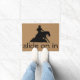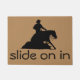 This clever welcome mat belongs on the reining horse farm for sure. It features a clip art silhouette image of a cowboy riding a reining horse coming to a sliding stop. The words on the mat read "Slide on in".