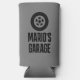 Slim Seltzer Can Coolers for man cave car garage. Personalize with name, fan club, monogram initials or quote. Car tire and rim with text. Automotive themed presents for guys. Grey or custom color background.