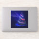 SlipperyJoe Christmas tree digital translucent red green blue ribbons glowing with festive energy concentric blue lights circles outward ethereal almost holographic presence radiant lights and sparkles artistic deep blue background gay pride gifts magical atmosphere emits beams trails of light LGBTQIA movement and flow