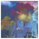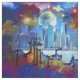 SlipperyJoe NYC graffiti moon surrounded swirling dramatic clouds sky intense color gradients vivid surreal cityscape realism fantasy skyscrapers buildings mashup urban grit artistic cosmic dreamlike backdrop gay pride gifts LGBTQIA blues fiery reds purples yellows dreamlike almost sci-fi narrative warm cool tones drama energy