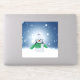SlipperyJoe's adorable Christmas snowman character artistic dreamy winter backdrop bright green mittens and scarf small orange carrot nose friendly coal like eyes powdery glitter covered snow layer glowing halo natural focal point cozy gray white winter hat pom pom matching ear flaps LGBTQIA gifts scattered bokeh orbs sparkling starbursts adorable festive wintery feel subtle pink blush cheeks whimsical holiday card feel