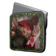 This laptop sleeve looks exactly as it does in picture. I actually thought is was too small until I put my laptop in it. It's a bit snug, but it fits. Figure it will stretch a bit, hopefully seams hold. Them seem good for now. I didn't have any personalization done, looks great as is.