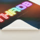 SlipperyJoe's throb rainbow-like gradient thick capitalized letters dotted texture filling blurred blue orange red hues swirls intensifying visual impact neon dreamscape ambient lighting psychedelic neon signage art gay pride gifts edgy branding LGBTQIA hypnotic design artistic charged word choice