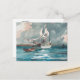 A postcard with the fine art painting by Winslow Homer (1836-1910) Sloop, Bermuda (1899). A seascape of a sloop in the aqua blue waters off Bermuda. Homer traveled to Bermuda, Cuba and Florida. Many of his paintings are from this area.