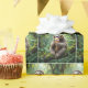 A sloth is perched on a moss-covered branch, enjoying a rainbow ice cream cone in a lush jungle setting