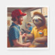 Introducing our delightful Sloth fast food worker. Embodying the essence of patience and care, our sloth is ready to help any customer at his own pace. Dressed in a fast food restaurant uniform, he’s at the counter helping a customer. This everyday scene, illuminated by soft lighting, is a testament to the saying - good things come to those who wait.