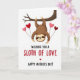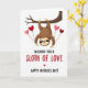 This Mother's Day card features a sweet, furry animal hanging upside down from a sturdy tree branch, colored in warm brown shades with soft facial markings and a calm, wide-eyed look that feels gently affectionate ❤️. Its small hands hold several heart-shaped balloons that float upward in rosy pink and deep red, their thin strings curving gracefully across a bright white background. The simple scene leaves lots of open space, letting the tender pose and the floating hearts carry a friendly, romantic tone. Beneath the illustration, the main line of text reads “WISHING YOU A SLOTH OF LOVE” in a casual, hand-lettered style, set in a darker tone that stands out clearly. Just below that, “HAPPY MOTHER’S DAY!” appears in matching lettering, followed by a tiny red heart for an extra hint of warmth 🌼. The layout keeps the character centered, with the balloons rising above and the message anchored neatly underneath. The branch stretches across the upper area while the balloon hearts drift diagonally upward, creating a light, airy sense of motion. A small crimson heart sits at the end of the lower message line beneath the hanging animal.