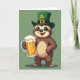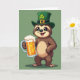 This card shows a cheerful cartoon sloth centered on a muted green background, looking like it’s ready to toast a friend 💚. Its rich brown fur has gentle texture with lighter underparts, and its big black eyes gleam above a wide, friendly smile that feels inviting. The sloth wears an emerald leprechaun hat with a black band, a gold buckle, and a small green shamrock tucked on the front. In its left paw, it lifts a glass mug of golden-amber drink topped with a thick white foam, with tiny bubbles visible in the liquid. Its right arm rests on its hip, giving it a confident stance, like it’s posing for someone special just out of frame ☘️. Any greeting text would sit neatly above the character in a light color such as white or pale yellow so it stands out against the green. The scene stays simple and focused, with the sloth, the hat details, and the frothy mug as the main visual elements.