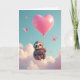 This adorable image features a cute, fluffy baby sloth happily floating through a dreamy sky, holding onto a large, shiny pink heart-shaped balloon. The sky is a soft blue, with whimsical pink and white clouds below and around the sloth. Several delicate pink butterflies flutter in the air, adding to the gentle and enchanting atmosphere. The sloth has a sweet smile, making the scene incredibly charming.