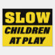 Big and bold with easy to read typography text. Yellow and black neighborhood children at play safety sign. Get your neighbors to slow down when driving through on your street. Purchase several and display in several neighbors yards. Perfect for schools and playgrounds too!