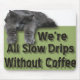 A lazy cat draped over the words We're All Slow Drips Without Coffee.