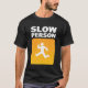 This design features a cartoon character of a person struggling to run a marathon, with a humorous twist on the typical image of a fast runner.