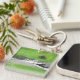 This keychain design features a photograph of a small pedestrian footbridge that carries a dirt path over a small stream. There is grass beside the path, along with some tree and shrub-like plants nearby.