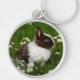 A simple, cute, lone rabbit casually nibbling on some fresh greens; surrounded by cute white daisy flowers.