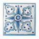 Decorative ceramic tile a design influenced by a traditional Sicilian style, created and painted by the artist Alan Skyrme who has family links to the island. Painted in shades of blue on a white background.