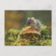 Small mouse sitting on a top of a mushroom postcard
