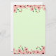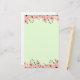 A green stationary with beautiful small pink flowers along the top and bottom sides of the stationary pattern. The flowers have dark red centers and small green leaves on their stems.