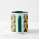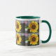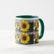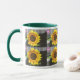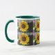 Sunflower design repeated on sturdy coffee mug- two sizes, customizable with different colors, sizes. Brighten someone's day with this lively mug !