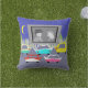 Pass the popcorn! This Small Town Drive-In Movie Outdoor Pillow will transport you to a simpler time, when gas was cheap, rock and roll was young, and the movie stars of Hollywood's Golden Age shined brighter than the night sky. The design features the rear view of five, virtually indestructible, retro cars in colors of red, pink, turquoise, jade and yellow. In front of the cars is a giant movie screen, showing a black and white movie, featuring two, star-crossed lovers in hats and trench coats. In the background, there is a grey, picket fence, a row of green, cedar trees, a royal blue sky and a yellow, crescent moon. We hope you've enjoyed our feature presentation!