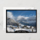 Postcard of the small village Sankt Magdalena in Villnoess valley with the Geisler Dolomites mountain peaks in the background covered in snow in winter season in South Tyrol, Italy with a black edge and the text 'Südtirol'..