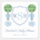 This classic favor / thank you sticker design features a simple 3 letter monogram crest flanked on either side by a handpainted topiary ball in a ginger jar planter adorned with blue floppy bow. Watercolor elements were painted by me onto 100% cotton paper and scanned into digital form. The crest shape is by another artist. This design would work equally well for a baby shower (where the baby's name has been announced) or for a wedding / couples shower.