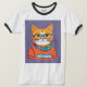 The T-shirt features a bold, artistic cat graphic that can either be a sleek silhouette or a stylized illustration. Options include a minimalist line drawing of a cat in a contemplative pose or a more detailed geometric pattern that hints at a cat’s form.