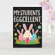 Designed with a deep black background, this illustration uses bright spring colors and school-themed icons to set a cheerful scene 🌷. Along the bottom, three large egg shapes sit close together like friends leaning in for a photo, each topped with upright bunny ears 🐰. The middle egg is white and covered in small multicolor flowers, while the left egg is soft pink with pale circular spots and the right egg is sky blue with white dots. They rest on a curved strip of green grass, with two orange root vegetables and leafy tops tucked nearby like a shared garden find. Centered in front of the eggs is a fuchsia gift box tied with a red ribbon, adding a sweet “for you” moment to the arrangement. Near the top, a rounded white message stretches across the card, with the words evenly spaced and easy to read against the dark background. Around the lettering, a yellow pencil-like writing tool and a small globe float among scattered blossoms and colorful dots, with the globe shaded in blue and green.