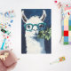 Playful twist to cute animal art and humor with a quirky white llama rocking teal glasses and holding a leafy branch.
