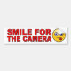 A funny car bumper sticker. Smile For The Camera. With a yellow cartoon face.