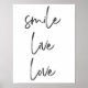 Give your home or office an inspiring atmosphere with this stylish "Smile, Live, Laugh" poster. The powerful message encourages you every day to enjoy life, to stay positive and to walk through the day with a smile. Perfect for every wall, whether in the living room, bedroom or work area - this poster not only brings motivation but also modern style to your rooms. Printed on high quality paper for vivid colors and long shelf life. A great gift idea for friends, family or just for yourself!