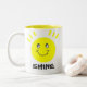 A cute inspirational coffee mug with a yellow inset and a yellow face with the word shine underneath. Reminding you to let your light shine.