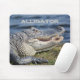 In profile, up close and personal, an American Alligator from The Florida Everglades on this mouse pad. Wrestle with this toothy grinning gator for fun or work. This large predator reptile has its mouth open wide showing sharp teeth and looking like he is smiling. Easily personalize with a Name.