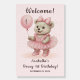 Say “Welcome!” in the most charming way with this Smiling Ballerina Bear Birthday Sign—featuring an adorable teddy bear in a ruffled tutu, bow, and ballet slippers. She’s holding a pink balloon that can be personalized for any age, making it perfect not only for a 1st birthday but also for 2nd, 3rd, or beyond!