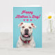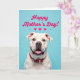 The front design shows a light-furred, bulldog-like dog facing forward, with its cheerful face filling the lower half of the card as if leaning in for a friendly hello ❤️. Its wide, upturned mouth shows a pink tongue, and the soft folds around the muzzle give it a tender, affectionate look that feels like a warm nuzzle. Deep brown eyes look straight ahead with an inviting, gentle gaze, like the kind you share with someone you adore. A bright red collar circles its neck, standing out against the creamy coat and adding a sweet, dressed-up touch. The background is a smooth, sky-blue field that keeps the scene airy and calm, letting the dog’s expression take center stage. Near the top, the words “Happy Mother’s Day!” appear in vivid magenta lettering, centered above the dog’s head for easy reading 🌼. Three small magenta hearts sit near the message, echoing the collar’s warmth against the cool blue backdrop. Soft, even lighting highlights the fur texture and the rounded contours of the face against the simple blue background.