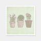 Paper napkins with a whimsical design. 3 cute cactus all in a row with smiling faces sitting in a flowerpot each wearing some jewelry.