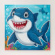 Cute artistic portrayal of a grinning blue shark in an underwater setting surrounded by vibrant coral.