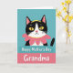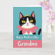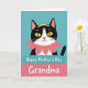 This card features a stylized black-and-white cat peeking up from behind a rounded teal banner, as if leaning in for a friendly hello ❤️. The cat’s yellow almond-shaped eyes and small pink nose give it a tender, affectionate look, like it’s smiling at someone it cares about. A bright pink flower with multiple petals sits at the cat’s neck like a collar, edged with a thin yellow ring that also loops around the top of its head. The background stays a solid teal, keeping the scene calm and letting the cat and flower stand out. Near the lower half, a layered banner holds the message, with “Happy Mother’s Day” set in white lettering across the upper teal strip. Just beneath it, “Grandma” appears larger in white on a pink strip, creating a cozy, close-to-the-heart focus 🌼. The teal and pink shapes are rounded and neatly stacked, with the cat’s head centered above the text bands against the plain teal backdrop.