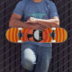 Smiling cat with funky orange background. Cool Skateboard