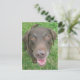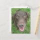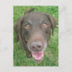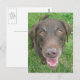 This dog breed-themed postcard design features a digital color photograph of a smiling rescued chocolate labrador retriever. It makes a unique gift for dog lovers!